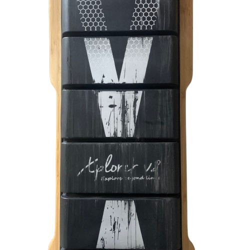 Xplorer V2 d’occasion Evo-Spirit, 88 km. Skate électrique tout-terrain avec pneus gonflables et batterie Samsung 50S. Vendu d’origine, peinture et deck bamboo abîmés.